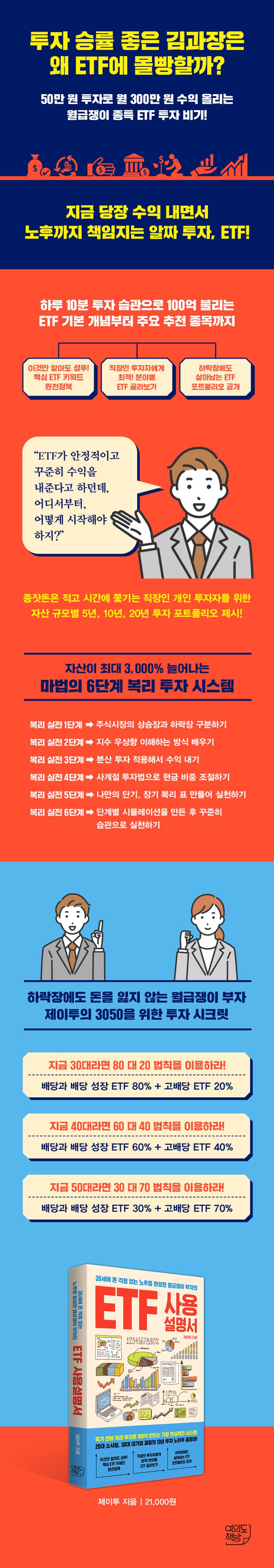 하락장이 두려워서 투자 타이밍을 못 잡다가 자가 마련도, 노후 준비도 놓친 이부장, 매일 모바일 주식 창만 바라보느라 회사 화장실에서 못 나오는 박대리, 결혼 자금을 코인 투자로 날린 후 애인도 승진도 놓친 양주임의 이야기가 혹시 당신에게도 해당되는 것인지 생각해보자. 앞으로 다가올 은퇴가 걱정되고, 당장 갚아야 할 빚이 두렵다면, 더 오를 금리 때문에 잠이 오지 않는다면, 이 책을 당장 읽어야 한다. 《ETF 사용설명서》가 당신의 인생을 바꿀 전환점이 될 것이다.