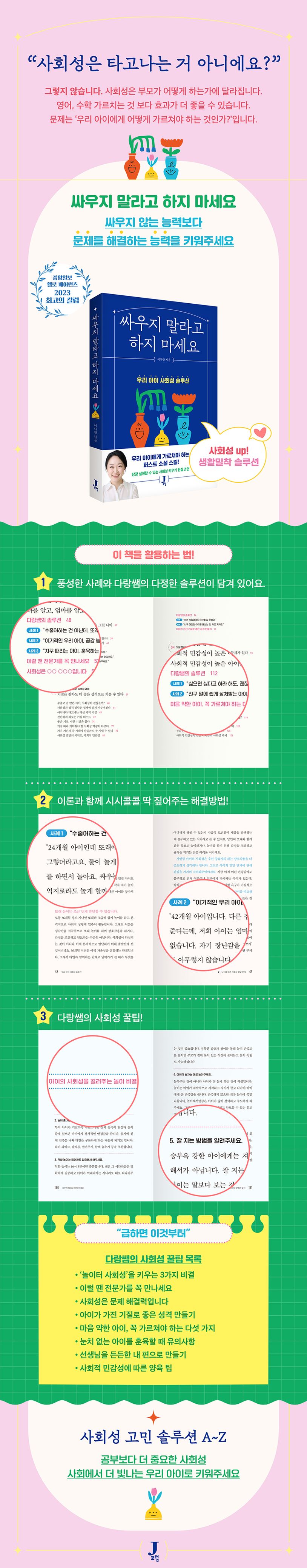 이제는 사회성이다! 심리상담 현장에서 영유아부터 청소년까지 모든 연령의 양육자가 고민하는 것은 바로 자녀의 사회성이다. “우리 아이가 친구가 없어요.”“강한 아이들에게 자꾸 치어요.”,“눈치 없는 아이, 미움받을까 걱정돼요.”,“아이가 친구들을 때려요.” 남모르는 고민에 육아카페 게시판을 기웃거리며 답답해하는 부모들에게 육아상담기업 ㈜그로잉맘의 대표이자 발달심리전문가 이다랑 저자가 《싸우지 말라고 하지 마세요》에서 다정하고 명쾌한 솔루션을 제시한다.