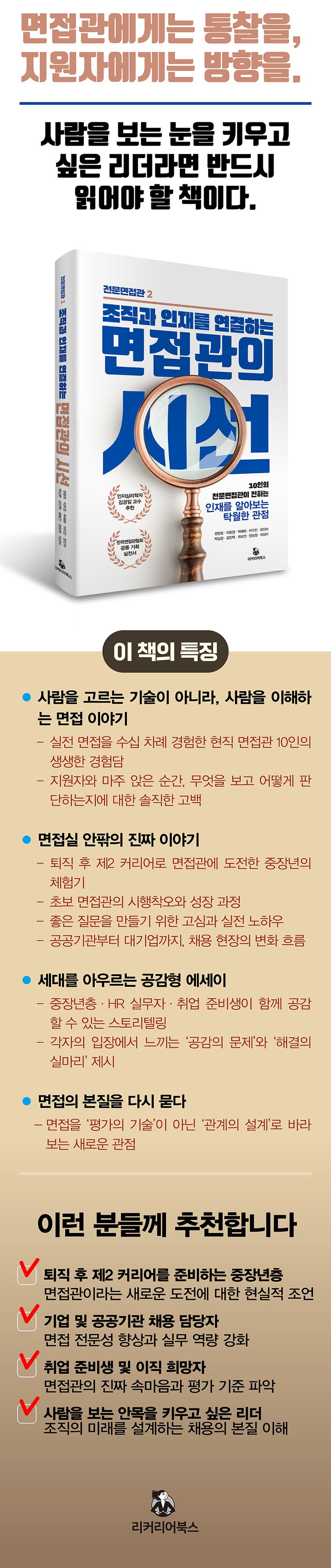 『면접관의 시선』은 대기업, 공공기관, 민간기업 등 다양한 채용 현장에서 수많은 면접을 진행해 온 현직 면접관 10인이 직접 집필한 실전 가이드다.