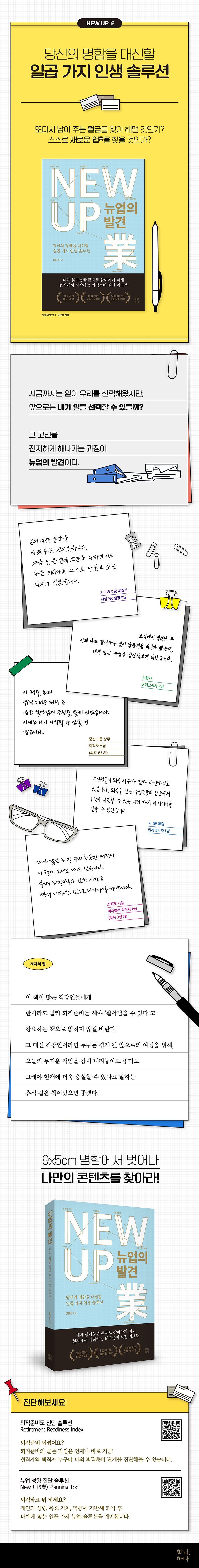 저자는 퇴직에 대한 불안과 두려움으로 가득한 이들에게 ‘뉴업’을 발견하는 과정을 단계별로 친절히 안내하며 중장기적 퇴직 전략을 스스로 만들어 퇴직 후 주도적인 삶을 살 수 있도록 이끈다. 그리하여 이 책은 이미 퇴직했거나, 당장 퇴직이 눈앞에 있거나, 언제 퇴직당할지 모르는 위기에 빠진 직장인 모두를 위한 것이다. 또한 아직 퇴직을 실감하고 싶지 않은 30대를 위한 직장 생존 가이드이자, 몇 해 전 보직에서 밀려나 오늘이 어제 같고 내일이 그저 오늘 같길 바라는 40대 직장인들의 완생(完生) 가이드이며, 희망하지 않은 희망퇴직으로 절망에 빠진 50대를 위한 커리어 회생 가이드이기도 하다.