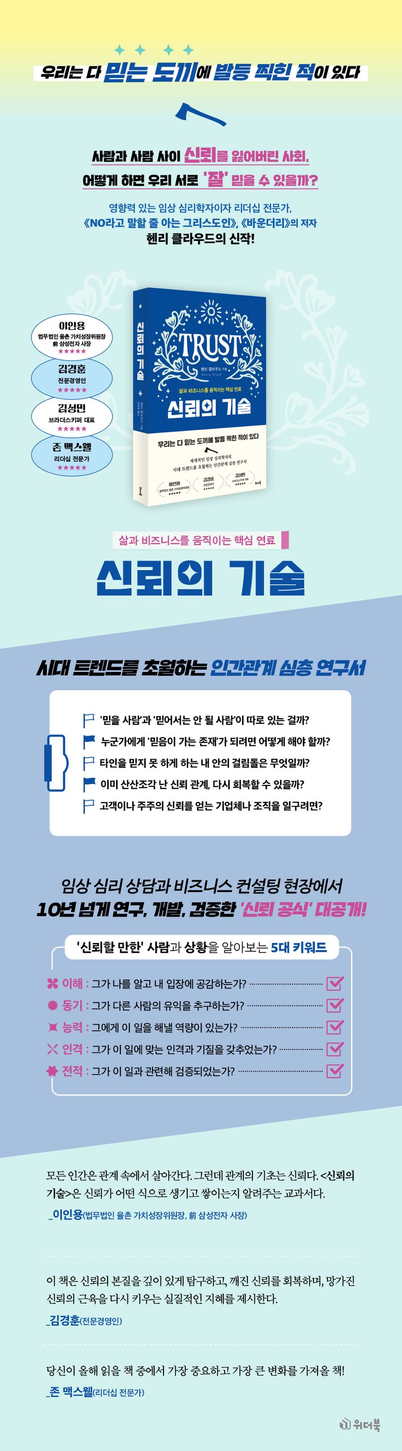 생물학적 · 신경학적으로, 인간은 날 때부터 서로를 믿도록 설계되어 있다. 신뢰는 갓난아기와 엄마 사이의 기초적 유대부터 시작해, 비즈니스를 비롯한 모든 협력 관계에 이르기까지 모든 인간관계를 견인하는 원동력이다. 그런데 때로 우리는 굳게 믿었던 사람에게 호되게 뒤통수를 맞는다. 신뢰해서는 안 될 대상을 신뢰했다가 마음고생은 물론 크고 작은 재정적 손실을 입고 건강을 잃기도 한다. 거기다가 한번 깨진 신뢰를 복구하기란 여간 어려운 일이 아니다. 그러므로 우리는 신뢰해야 할 사람과 상황을 잘 분별하는 법을 배워야 한다. 강력한 본능적 신뢰 욕구들을 조절하기 위한 ‘객관적인 판단 능력’을 길러야 한다. 곧 신뢰의 기술이다.