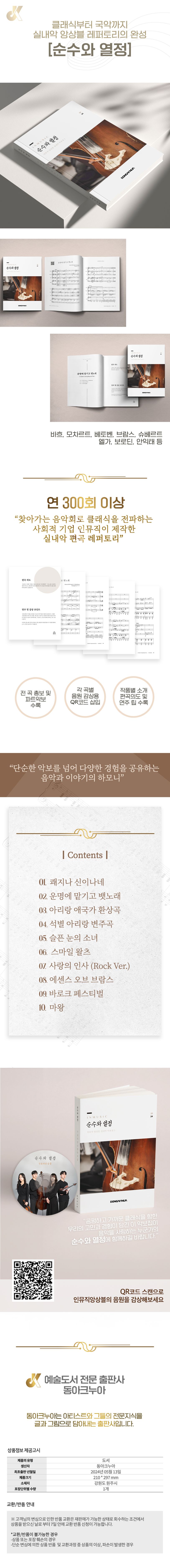 인뮤직 앙상블이 새롭게 출간한 악보집 ‘순수와 열정’은 클래식과 국악을 만나는 특별한 경험을 제공한다. 이 악보집은 베토벤, 슈베르트, 보로딘, 브람스, 안익태 등의 명작을 새로운 편곡으로 재해석한 10개의 작품으로 구성되어 있다.