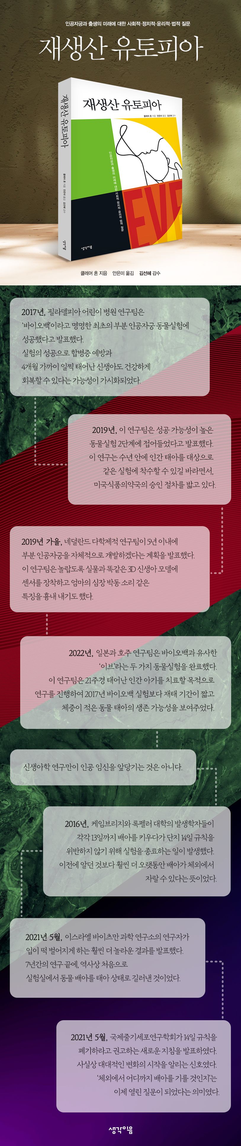 ‘인공자궁’이라는 체외발생 또는 체외임신 기술이 구현되기에 앞서, 이 기술이 미칠 우리 시대의 재생산 문제를 포괄적으로 다룬다. 다시 말해 현재 여러 나라에서 진행되고 있는 ‘부분 인공자궁’ 기술의 현실화가 코앞으로 다가오고 체외임신 전 과정을 구현하는 기술이 순조롭게 진행됨에 따라, 이 책에서는 이 기술이 걸어온 궤적과 의미, 윤리적 문제 등을 검토하고 악용 가능성 같은 미래까지 넘나들면서, 오늘날의 젠더화된 임신 및 출산에 관련된 복잡다단한 재생산 문제들을 다양한 측면에서 비판적으로 들여다본다.