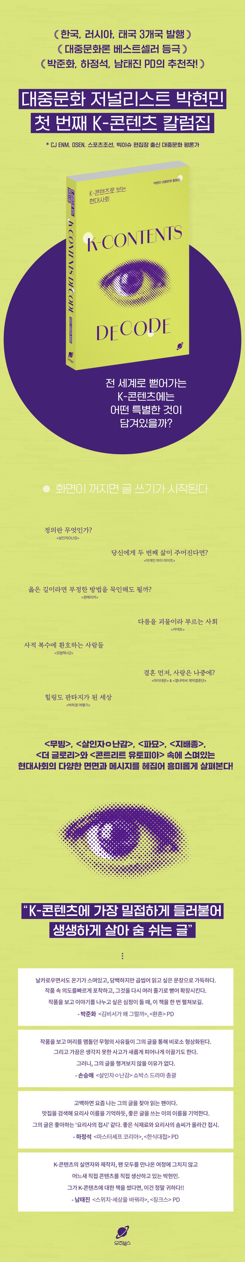 전 세계로 뻗어나가는 K-콘텐츠에는 어떤 특별한 것이 담겨있을까? 〈더 글로리〉와 〈이상한 변호사 우영우〉, 〈무빙〉과 〈피라미드 게임〉, 〈살인자ㅇ난감〉과 〈파묘〉 등 최근 국내외에서 크게 주목받은 K-콘텐츠를 통해 그 안에 숨겨진 현대사회의 면면들과 메시지를 헤집어 흥미롭게 살펴본다. 또한 이러한 일련의 과정을 거치며 콘텐츠를 단순히 소비하는 것에 그치지 않고, 능동적이고 면밀한 상호작용을 경험함으로써 유의미한 삶과 유익한 세상을 위해 사유하는 태도를 체득한다. 각종 미디어와 매체를 통해 대한민국을 대표하는 대중문화 전문가로 거듭난 박현민 평론가의 생생한 K-콘텐츠 칼럼집