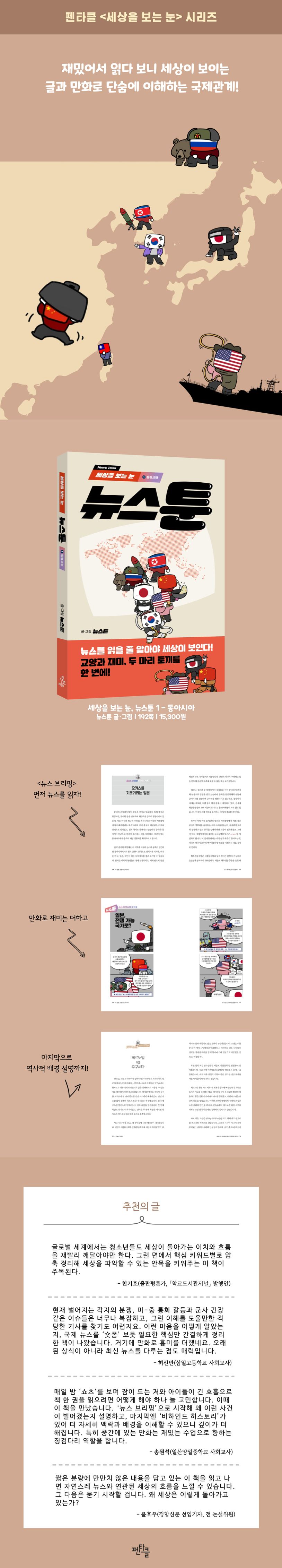 시리즈의 첫 번째 책인 『세상을 보는 눈, 뉴스툰 1』 동아시아 편은 한국, 북한, 중국, 미국, 일본, 러시아 등 한반도 주변국과 관련된 11개의 주요 뉴스를 다루고 있다. 단순히 국제 및 경제 뉴스를 요약하는 데 그치지 않고, 관련된 현대 세계사의 핵심 사건들을 정치, 경제, 문화 등 다양한 측면에서 자세히 설명한다.