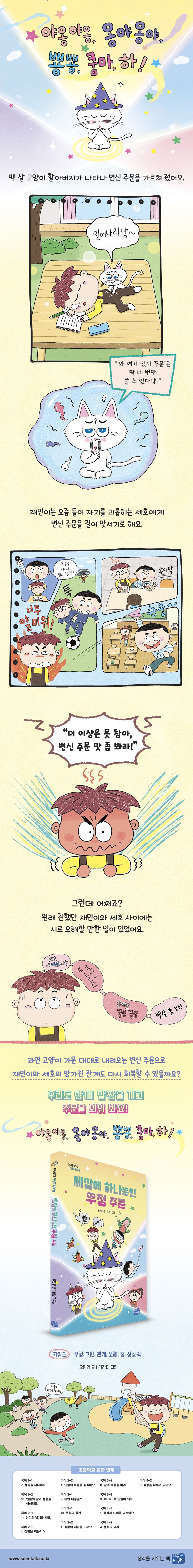 모두의 동화 시리즈 38권. 마술사를 꿈꾸는 재민이가 동네 아이들한테 괴롭힘을 당하던 고양이를 구한다. 은혜를 갚겠다며 나타난 고양이는 나이가 무려 백 살! 고양이 할아버지는 가문 대대로 내려오는 ‘왜 여기 있지 변신 주문’을 가르쳐 주고, 재민이는 요즘 자신을 괴롭히는 세호 앞에서 변신 주문을 외워 반격을 시작하는데…….