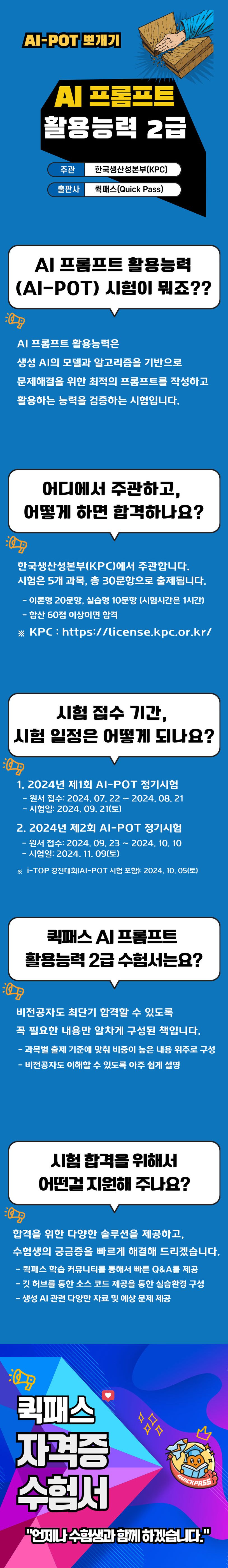 〈AI프롬프트활용능력시험알아보기〉1.AI프롬프트활용능력(AI-POT)이란?AI프롬프트활용능력(AI-POT)은생성AI의모델과알고리즘을기반으로문제해결을위한최적의프롬프트를작성하고활용하는능력을검증하는시험입니다.시험을통해다양한생성AI(챗GPT,제미나이,코파일럿등)를활용하여원하는결과를도출하는활용능력과업무생산성을향상하기위한프롬프트를만드는설계능력을습득할수있습니다.2.등급별직무및보유기술수준2등급직무:AI기술을이해하고명령(프롬프트)을설계하고실행하여원하는답변을얻을수있는능력을갖춘자보유기술:AI기본기술이해,생성AI프롬프트구현기술보통,리포트,이메일,문장요약,영어번역등AI사용에어려움이없는정도기술보유