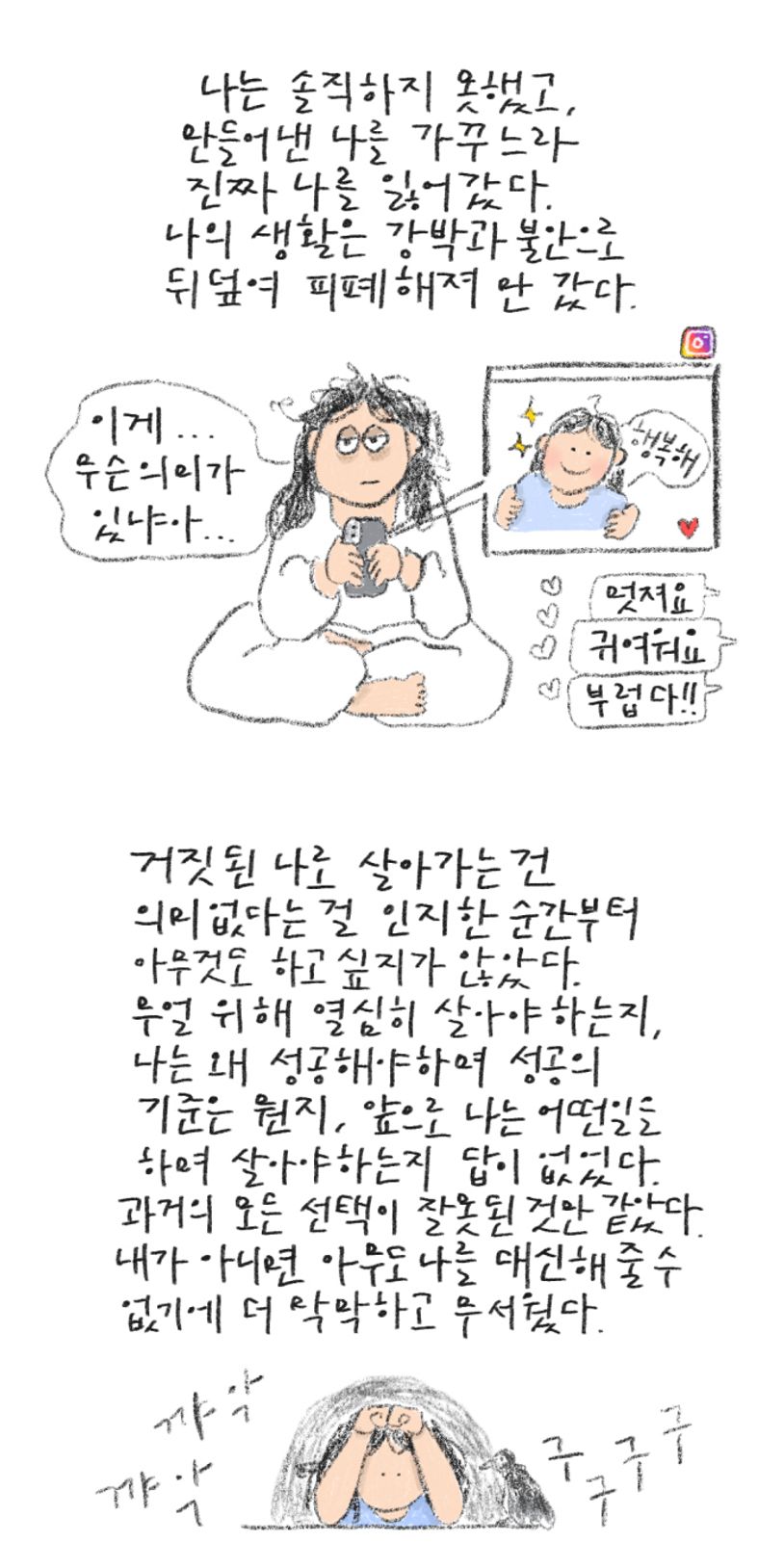 현재의 순간순간에 집중하며 하루를 보내면서 자연스럽게 내일을 계획하게 되었고, 그러다 보니 미래의 꿈과 목표를 세우고 있었다. “나만의 그림 에세이 출간하기”란 꿈을 향해 길면 길고, 짧으면 짧은 2년의 세월 동안 고통을 쓰고, 희망을 그렸다. 내가 과연 책을 끝까지 완성 시킬 수 있을까에 대한 불안이 엄습할 때도 있었고, 포기하고 싶은 날들이 종종 있었지만, 그럴 때마다 나와 같은 사람이 이 세상에 한 명이라도 존재한다면 그 사람에게 나의 이야기가 위안이 되길 바라는 마음으로 버텼다. 나 또한 한 사람의 이야기를 통해 다시 일어설 용기를 얻었기에, 나의 이야기도 누군가에게 작은 용기가 되어주었으면 좋겠다.