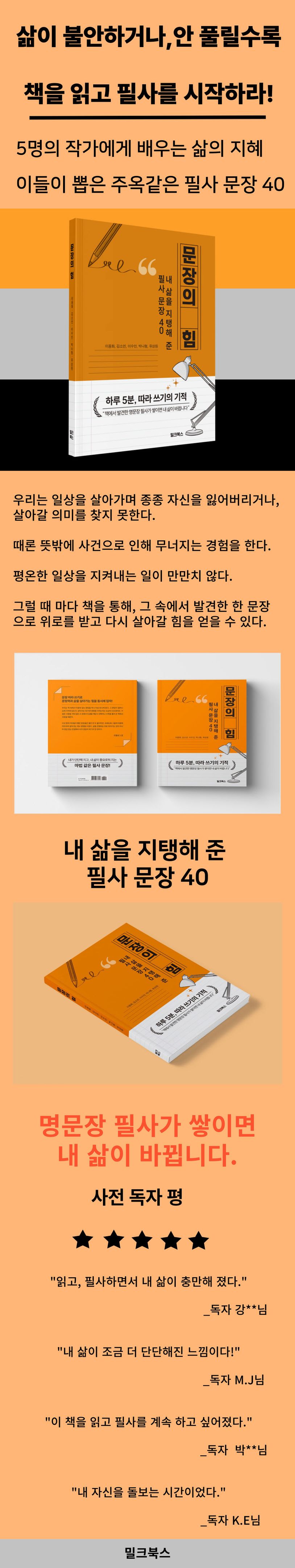 이 책은 다섯 명의 저자들이 가진 인생의 보물창고에서 가장 아끼는 문장들을 모았다. 저자들도 힘에 부치는 일이 생기거나 답을 찾기 어려운 일을 만나면 책을 찾았다. 그들이 풀어 놓는 삶과 그 속에서 발견한 보석 같은 문장을 만나보자. 그리고 바쁜 일상에서 5분 정도 시간을 내어 그 문장들을 필사해 보자. 명문장 필사가 쌓이면 어느새 예전보다 더 근사한 나를 만날 수 있을 것이다.