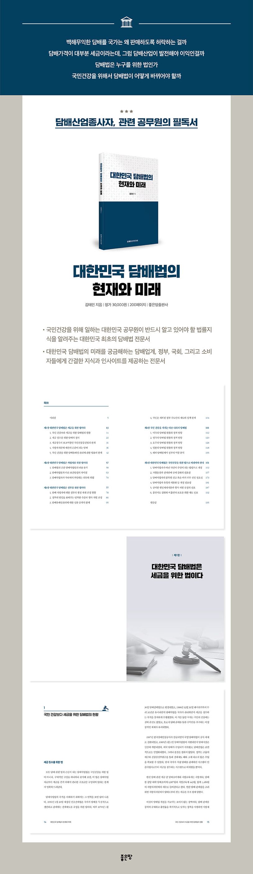 이 책은 담배법이 얼마나 세금 중심적인지를, 얼마나 사업자 중심적인지를, 정부가 얼마나 소극적인지를 법령을 통해 낱낱이 분석한다. 그리고 해외 사례도 분석하며, 국민건강을 최우선으로 하는 담배법으로의 전환을 위한 구체적인 방안을 제시한다. 결국 선진 제도를 운영하고 있는 제외국의 사례를 배우되, 국내 실정에 맞게 선별할 수 있도록 미국, 영국, 호주 등 선진국의 법령과 사례를 조사하고, 우리와 유사한 담배법 체계를 가진 일본도 함께 탐구한다.