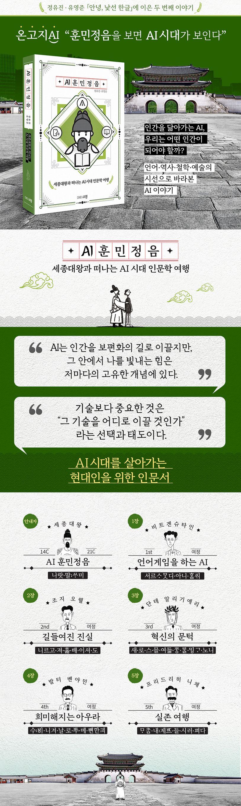 이로써 인공지능은 우리에게 ‘정보 문해력’의 길을 열어 줍니다. 마치 세종대왕이 훈민정음을 창제해 백성에게 ‘문자 문해력’을 선사했던 것처럼 말입니다. 《AI 훈민정음》은 이 역사적 평행선을 따라 세종대왕을 우리의 안내자로 소환하여 AI 시대의 본질을 성찰하고 올바른 길을 모색하기 위한 여정을 시작합니다. 그 길 위에서 단테, 비트겐슈타인, 조지 오웰, 발터 벤야민, 니체 등 사상가들의 통찰을 불러와 AI 시대를 해석하고, 그 속에서 우리가 던져야 할 올바른 질문을 찾습니다.