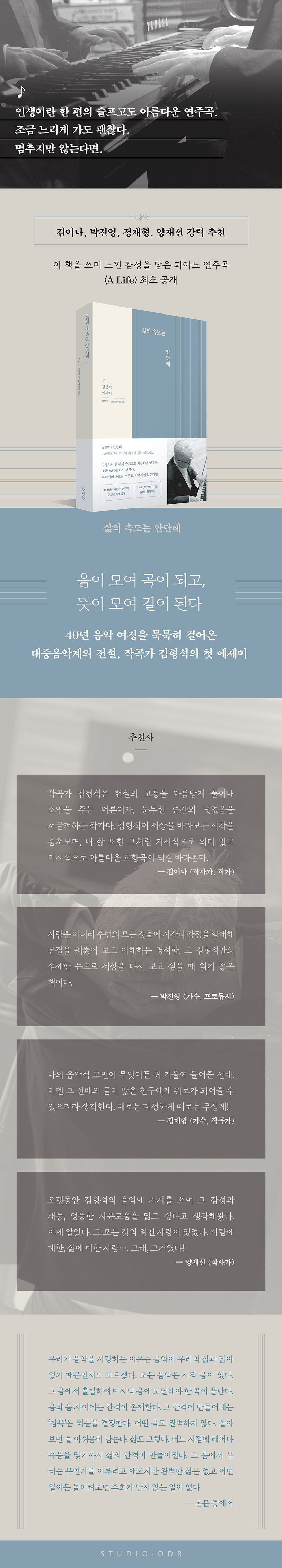 나는 인류학자도 아니고 A.I. 전문가도 아니고 바둑도 모른다. 다만 내가 ‘지금 이 순간’ 어디에 서 있으며, 어디를 향해 가고 있는가에 대해 음악 안에서 고민할 뿐이다. 음악을 만드는 과정도 사람들이 듣는 방식도 커뮤니티의 형태도 음악 시장도 예측하기 힘들 정도로 판이 달라졌다. 그럼에도 나는 여전히 음악을 만들고 음악을 사랑하고 음악을 즐긴다. 중간 과정이야 앞으로도 변하겠지만 음악에 대한 견고한 애정만큼은 변하지 않을 것이다. _〈프롤로그〉 중에서
