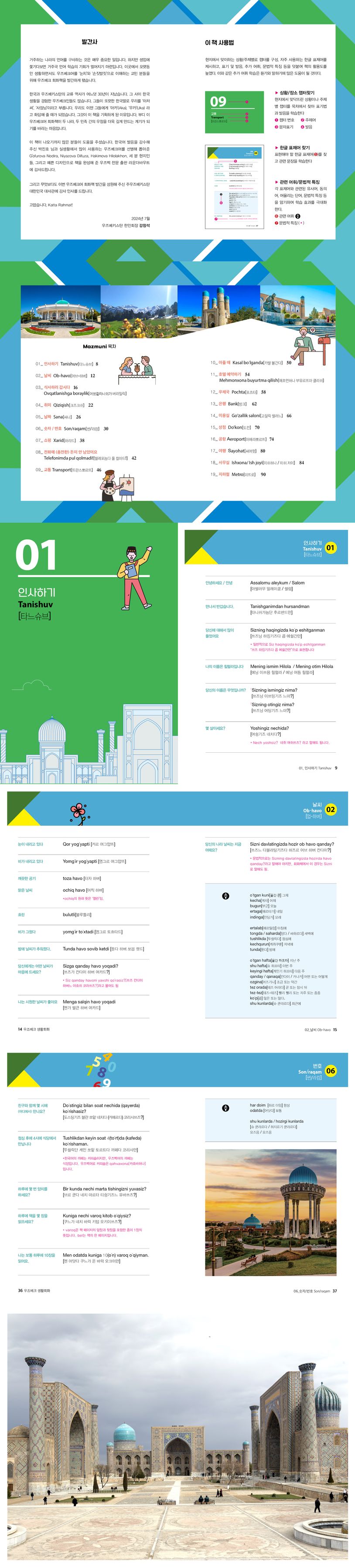하지만, 그동안 실용적인 우즈베크어 회화책이 별로 없어 여행객들과 비즈니스 맨들의 불편이 컸다. 이를 고려한 우즈베키스탄 한인회(회장 강창석)가 적극 나서 만든 책이 이 책이다. 현지 교민들의 오랜 경험을 바탕으로 실생활에서 가장 필요한 내용들만 추렸다. 예컨대, ‘인사하기’, ‘쇼핑할 때’, ‘호텔 예약’, ‘여행지에서’, ‘공항에서’ 등등, 이 책 한 권만 잘 갖추면 우즈벡 여행이 훨씬 편안하리라 장담한다. 많은 우즈벡 여행객들의 유용한 실용서가 되기를 기대한다.