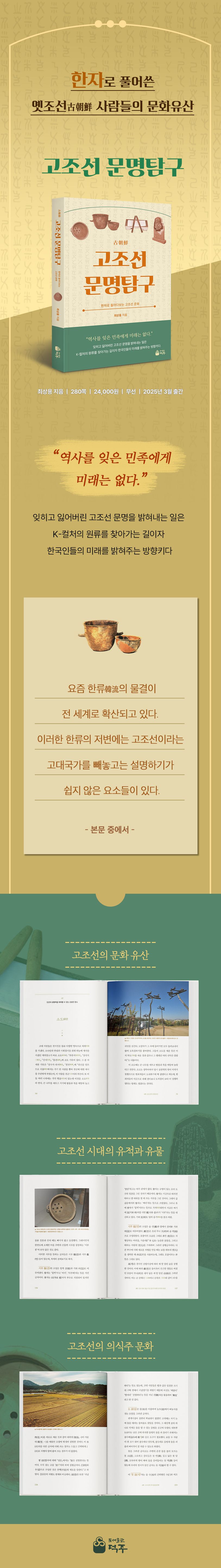 요즘 한류韓流의 물결이 전 세계로 확산되고 있다. 이러한 한류의 저변에는 고조선이라는 고대국가를 빼놓고는 설명하기가 쉽지 않은 요소들이 있다. 이 책은 고조선의 문화적 흐름이 오늘날까지도 면면히 이어지고 있음을, ‘고조선의 문화유산’ ‘한민족의 언어와 사상’ ‘신석기와 청동기 및 철기시대의 유적과 유물’ ‘고조선의 의식衣食문화’ ‘다양한 무덤양식과 제례문화’로 나누어 살펴보았다.