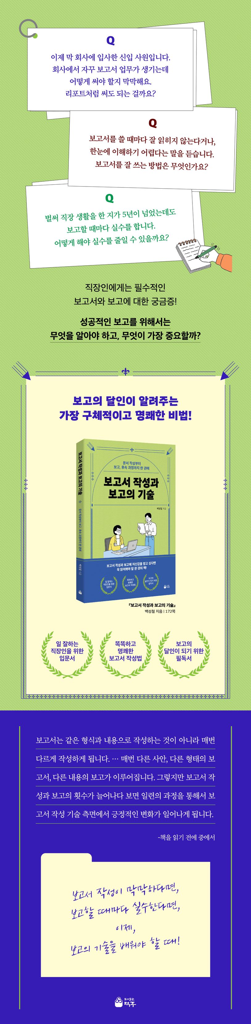 과연 보고서는 무엇을 중심으로 써야 할까? 장황하고 길게 내용만 많으면 되는 걸까? 보기에 멋지고 디자인적인 감각을 드러내면 되는 걸까? 이런저런 통계나 그래프를 넣어 소위 있어 보이게 만들면 되는 걸까? 직접 보고서를 써본 사람들은 알겠지만, 보고서를 쓰는 과정은 그리 단순하지 않다. 보고서를 쓰는 이유, 보고서를 받는 상대, 보고서에 꼭 담아야 할 것, 보고서에서 내고자 하는 결과 등 차근차근 방향과 단계를 파악해야 누가 봐도 이해하기 쉽고 읽고 싶은 보고서를 만들어낼 수 있다. 보고를 잘한다고 해서 회사 생활이 단번에 달라지지야 않겠지만, 일 잘하는 사람은 보고도 다르다는 것을 우리는 경험으로 알고 있다. KBS에서 오랫동안 근무한 저자가 수많은 보고서를 작성하고 보고하면서 쌓아온 보고서 작성법과 보고의 기술을 통해 잘 쓴 보고서란 어떤 과정이 필요한지 알아보자.