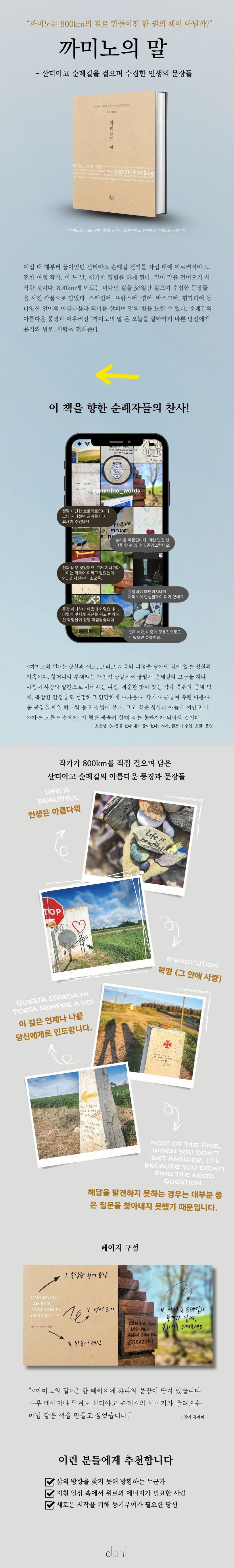 그러던 중 저자는 신기한 경험을 하게 된다. 순례자의 낙서, 현지인의 안내문, 표지판, 조형물 등 순례길 위에서 만나는 다양한 언어의 문자들이 자꾸 눈에 밟힌 것. 매일 지친 걸음을 재촉해야 하는 순례자들에게 뜻 모를 낙서 앞에서 시간을 지체하는 건 어리석은 일이지만, 저자에게는 이 모든 문장들이 범상치 않게 다가온 것이다. 마치 길이 자신에게 말을 걸어오는 것 같다는 생각마저 하게 되면서 저자는 좀 더 귀 기울여 까미노의 말을 수집하기로 결심한다. 자신만의 까미노 프로젝트를 시작하게 된 셈이다.