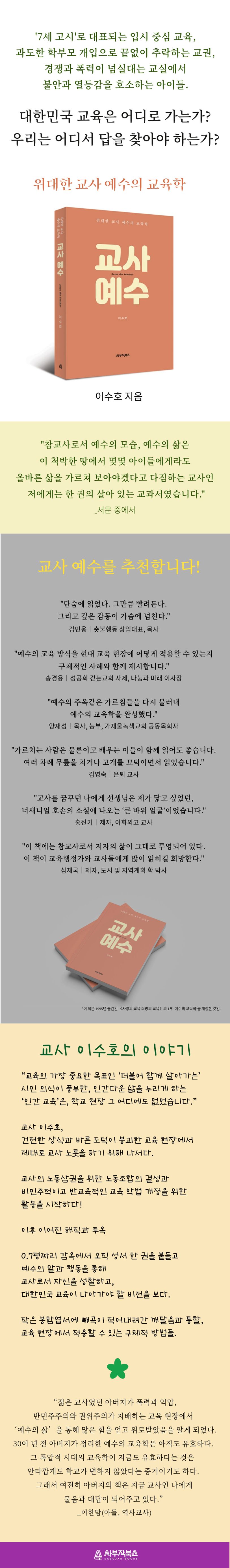 그는 0.7평 독방에서 오직 성경 한 권을 붙잡고 기도하며 읽었다. 그리고 깨달았다. 예수야말로 진정한 교사였고, 그의 가르침 속에는 대한민국 학교와 교육이 나아가야 할 방향이 담겨 있다는 것을! 그는 예수의 행적을 교육의 관점에서 바라보며, 교사로서 자신의 삶을 반추하면서, 교육의 현장을 축제의 현장으로 만들 수 있을지 구체적인 방법들까지 정리했다.