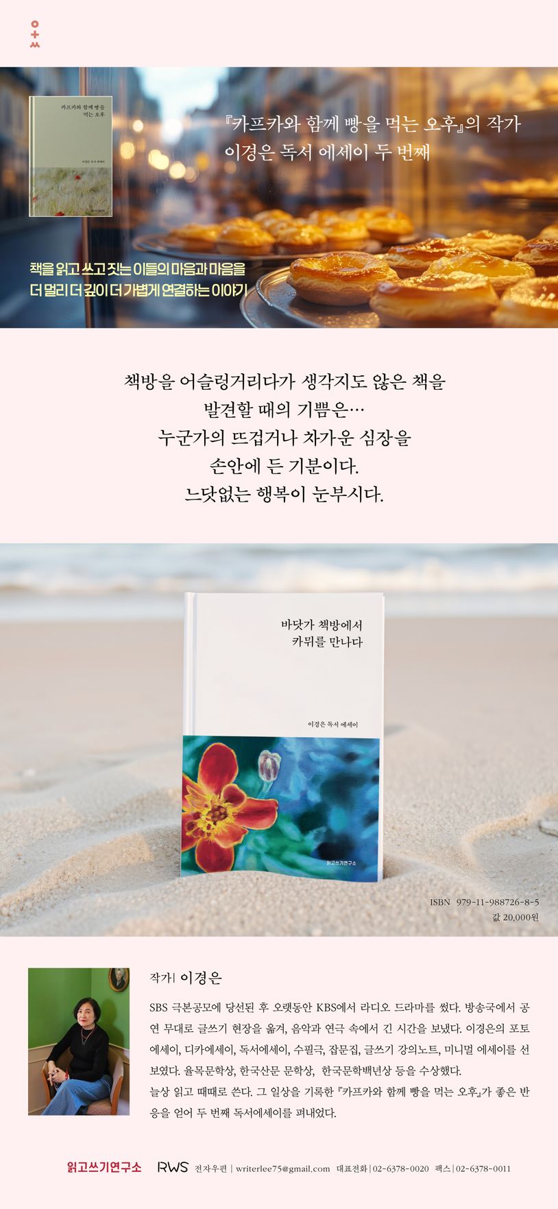 책과의 만남을 통해 이 세계와 자신의 만남을 확장해 나가는 순간들을 섬세하게 포착한 독서 에세이 『바닷가 책방에서 카뮈를 만나다』. 라디오 드라마와 음악극 등의 대본작가로, 수필가로, 글쓰기 강사로 활약해온 작가 이경은의 두 번째 독서 에세이집이다. 첫 번째 독서 에세이 『카프카와 함께 빵을 먹는 오후』(2023)와 이어지는 책으로 전작과 유사하면서도 색다르다. 소개하는 책의 서지정보 앞에 독서의 흥취를 더해줄 음악과 음료를 페어링 한 것이 눈에 띈다. 2024년 가을부터 2025년 여름까지 ‘데일리한국’에 연재한 글을 기초로 하여 빼고 덧붙이고 다듬어 엮은 이 책의 곳곳에서 저자 내면의 흐름과 함께 저자가 감각하는 세계의 변화를 읽을 수 있다.