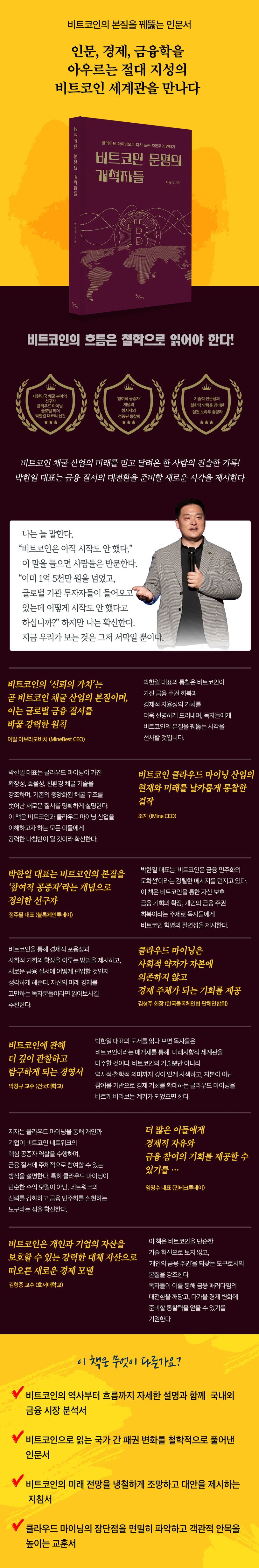본 도서에서는 비트코인의 탄생 배경은 물론 그에 따른 철학적, 정치적, 지리학적인 논의를 바탕으로 비트코인의 세계관을 인문학으로 풀어내고 있다. 또한 미래 금융 민주화를 향하는 비트코인의 역할을 새로운 시각으로 바라보는 계기를 마련한다. 더 나아가 스스로 자산을 보호하고 미래를 설계할 수 있는 금융 대안으로 클라우드 마이닝을 소개함으로써 다른 도서들과는 확연한 차별점을 두고 있다.