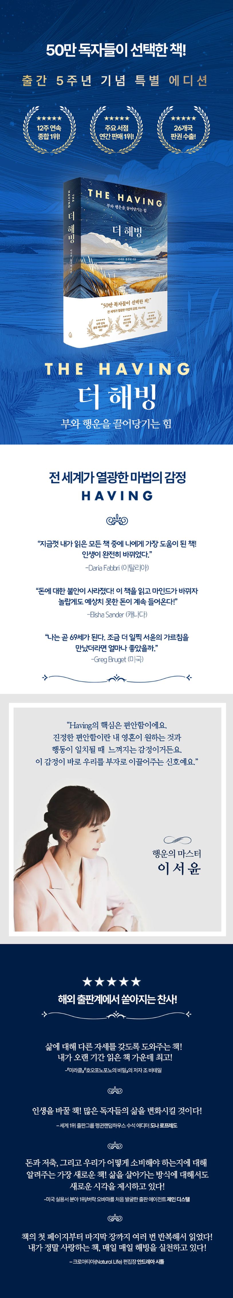 부와 행운을 만나는 출발점, 마법의 감정 Having! 국내 최초로 미국에서ᅠ선(先)출간되어 세계가 먼저 찾아 읽은 책! 영미권을 비롯 프랑스, 독일, 이탈리아, 러시아, 브라질 등 26개국에 판권이 수출되어 ‘불안감이 사라지게 해준 책’, ‘행운의 바이블’, ‘이 책을 읽고 행운이 찾아왔다’ 등 찬사를 보낸 이 책은 마음가짐을 다듬으며 원하는 것을 얻는 놀라운 가르침을 담고 있다.