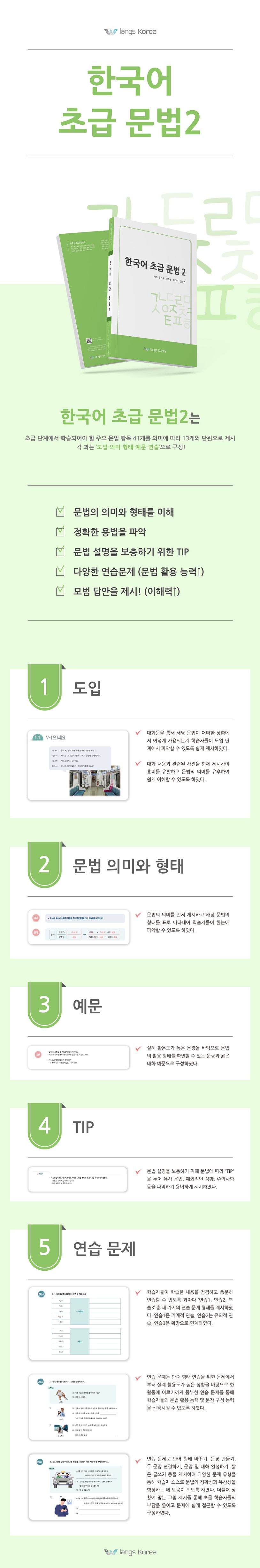 『한국어 초급 문법 2』는 문법의 의미, 형태, 예문, 연습의 단계적 학습을 통해 의사소통 능력을 향상시킬 수 있는 교재입니다.