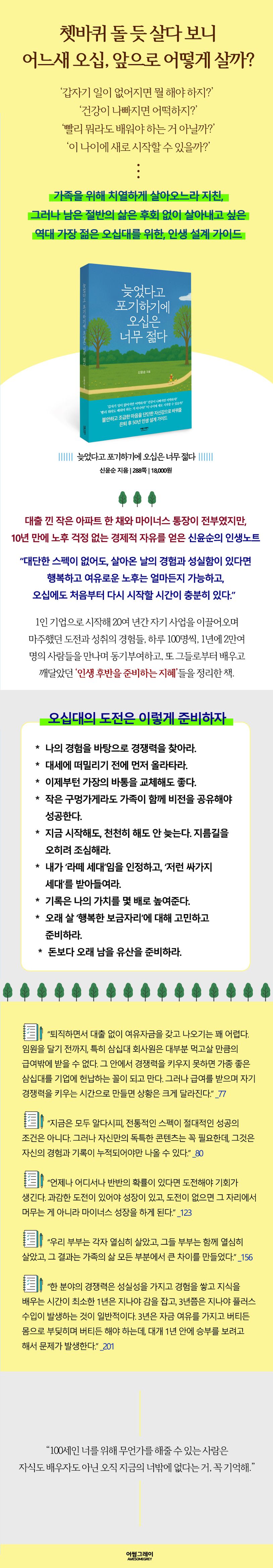 인생 2막을 위해 무엇을 해야 할지 막막한 독자라면 이 책을 통해 방향을 찾고 자신감을 얻을 수 있을 것이고, 새로운 도전을 계획 중인 독자라면 좀 더 꼼꼼하게 준비할 수 있을 것이다. 또 이미 무언가 시작한 독자라면 위로와 공감, 성찰의 시간을 가질 수 있을 것이다.