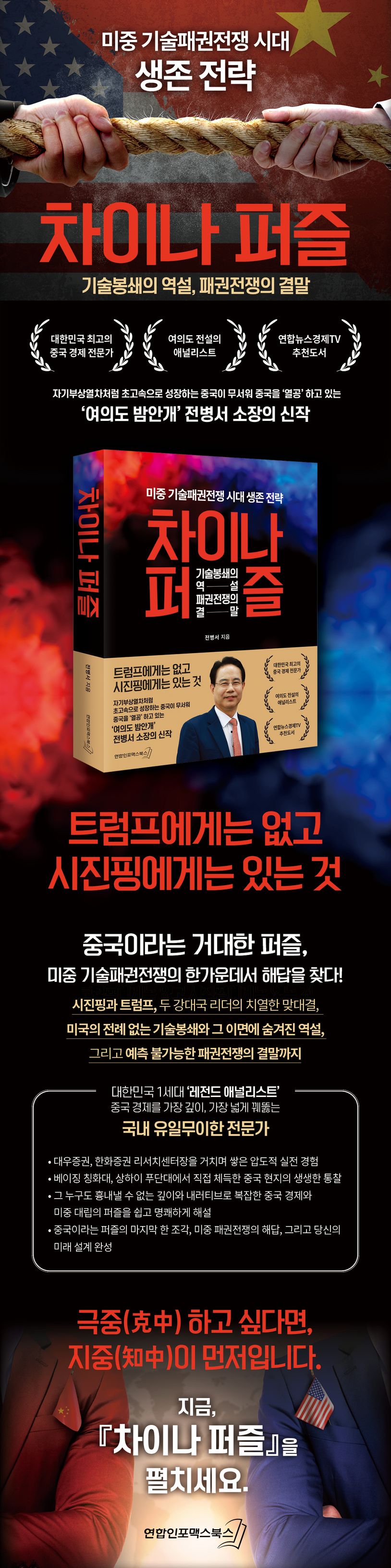 머리말_차이나퍼즐(ChinaPuzzle)PART01│‘제조의덫’에빠진미국,‘달러의덫’에빠진중국01미국MAGA의본질은‘제조의덫’02기축통화달러의숙명,‘트리핀의딜레마’03100년금융패권의달러구매력은97%하락04트럼프2.0,담대한‘마러라고협정(Mar-a-LagoAccord)’구상05‘마러라고협정’구상,미완의성공으로종지부가능성06미국이노리는마지막전쟁은금융전쟁PART02│트럼프노믹스2.0에대한7가지대예측01WHYTrump-기인(奇人:괴팍한천재)의시대02트럼피즘2.0은그냥이것저것다섞은‘비빔밥’정책03‘가장위대하지않은대통령’의위대한미국건설04트럼프에게는없고시진핑에게는있는것05트럼프노믹스2.0에대한7가지대예측PART03│25년간지속되어온‘중국위기론’의진실01‘중국위기론’에서‘탈(脫)중국론’까지25년02중국,절대성장률이아닌상대성장률로봐야한다03중국굴기의7할은미국의헛발질때문04중국의미국추월은진행중05가게가커지면종업원이손님을낮게본다06중국의‘진짜위기’와‘가짜위기’의구분PART04│차이나퍼즐,중국이과학기술에강(强)한이유01‘니담퍼즐’과야성황교수의‘중국필패론’02사회주의는‘창의성의지옥’이라는오해03세계10대전략핵심산업중7개산업,중국1위04중국이과학기술산업에서강한이유는‘7s’PART05│미·중기술패권전쟁의승자는?01트럼프가중국을맹수처럼공격하는이유는‘공포’02중국,미국에장단은맞추지만춤을추진않는다03미·중기술패권전쟁의승자는?04트럼프의‘트럼플라자합의’구상의성공가능성05바닷물마신중국이금융시장을열어야하는이유PART06│반도체전쟁시대,대만문제는한국문제다01미국에있어대만은‘불침항모(不沈航母)?’02중국에있어대만은‘태평양출입구’인동시에‘반도체’낳는암탉?03중국이대만을폭격하지못하는이유는?04TSMC미국에1,000억달러투자하는이유05대만문제는한국문제다?PART07│다시풀어야할차이나퍼즐01미·중패권전쟁에서한국의대응전략02탈(脫)中,감(減)中,진(進)中을제대로구분해야03한국의외교수명은반도체와같이간다04‘미국책,한국책’으로중국을공부하면진다05한국,‘돈(錢)’과‘반도체’를일하게하라06중국에‘??아온삶의경험’을투자하라PART08│향후5년새정부의바람직한대중전략은?01성장률0%시대,새정부의한·중관계재정립방향02역대정부의대중전략과새정부의차별화03신정부의바람직한대중국외교전략04신정부대중외교의10대대응전략05향후5년미·중관계와대·중외교에서주의할점