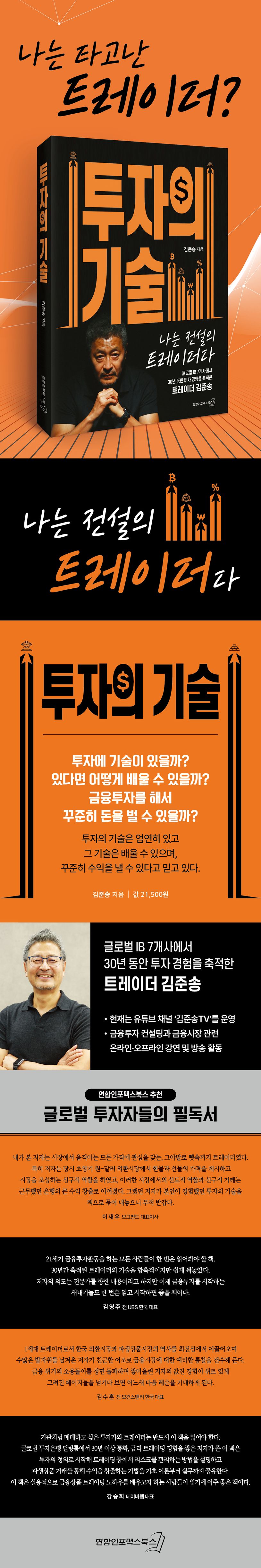 투자에 기술이 있을까? 있다면 어떻게 배울 수 있을까? 배우고 나면 금융투자를 해서 꾸준히 돈을 벌 수 있을까? 이 책은 이런 질문에 답하고 있다. 결론만 말한다면 투자의 기술은 엄연히 있고 그 기술은 배울 수 있으며, 그를 통해 꾸준히 수익을 낼 수 있다. 투자를 준비하는 학생, 그리고 현재 투자를 하고 있는 개인 투자가뿐만 아니라 금융기관에서 일하는 펀드매니저, 트레이더, 세일즈, 지원 부서에게도 많은 도움이 될 것이다.