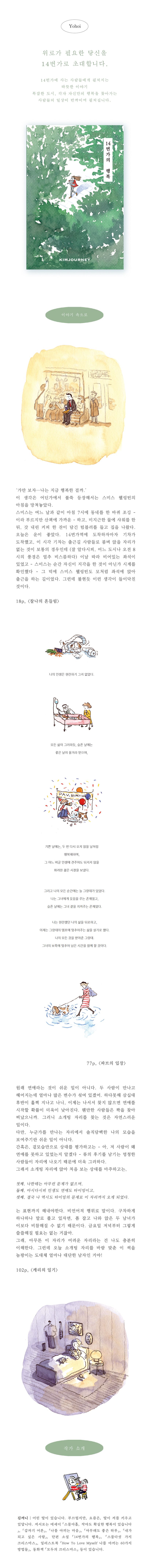 작가는 잉크펜과 수채화로 일상의 행복과 유머, 그리고 상상 속 세상을 따뜻하게 그려냅니다. 그녀의 작업은 평범한 일상 속에서 발견하는 소소한 즐거움과 상상력을 바탕으로, 독자들에게 새로운 시각을 선사합니다.저서로는 에세이 『스물아홉, 작아도 확실한 행복이 있어』, 『나를 아끼는 마음』, 『아무래도 좋은 하루』, 『내가되고싶은사람』, 단편소설 『14번가의 행복』, 『스물다섯 가지 크리스마스』, 『폴라리또와 나』 등이 있습니다.