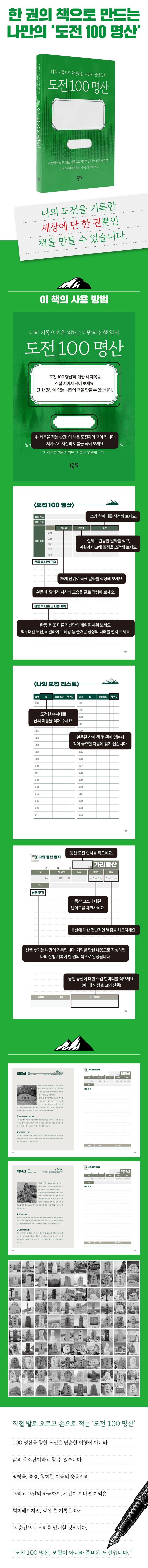 대한민국의 아름다운 100 명산을 도전하는 이들을 위한 특별한 워크북이 출간되었습니다. 『도전 100 명산』은 단순한 등산 안내서가 아니라 독자 스스로 산행의 발자취를 남기고 나만의 기록을 완성할 수 있도록 구성된 기록형 노트입니다.