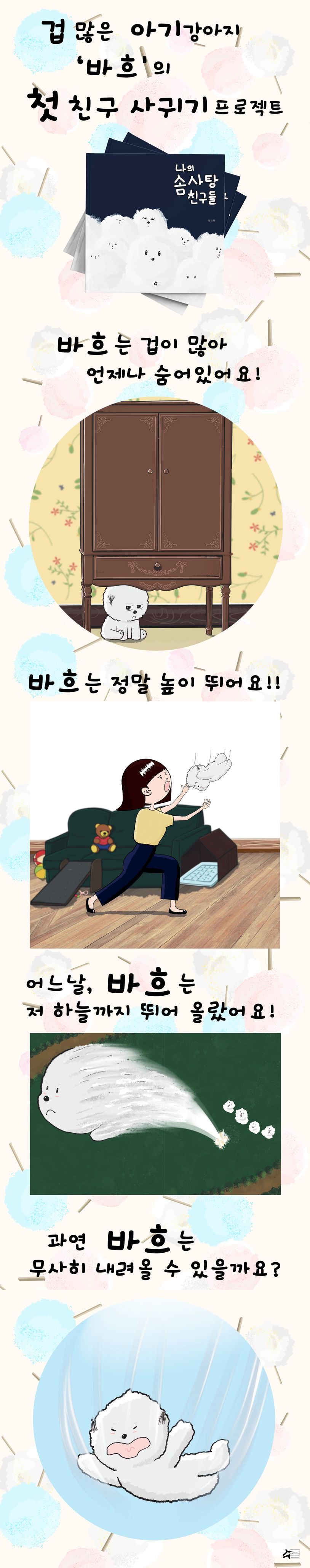 겁 많고 수줍음이 많아 언제나 숨어있는 아기 강아지 ‘바흐’도 설렘보다 두려움이 더 강한 친구입니다. 아기 강아지 ‘바흐’를 통해 처음 친구를 사귀는 아이가 두려움과 공포를 극복하며 친구를 사귀게 되는 과 정을 아이다운 시선과 상상력으로 표현한 재미있는 그림 동화책입니다.