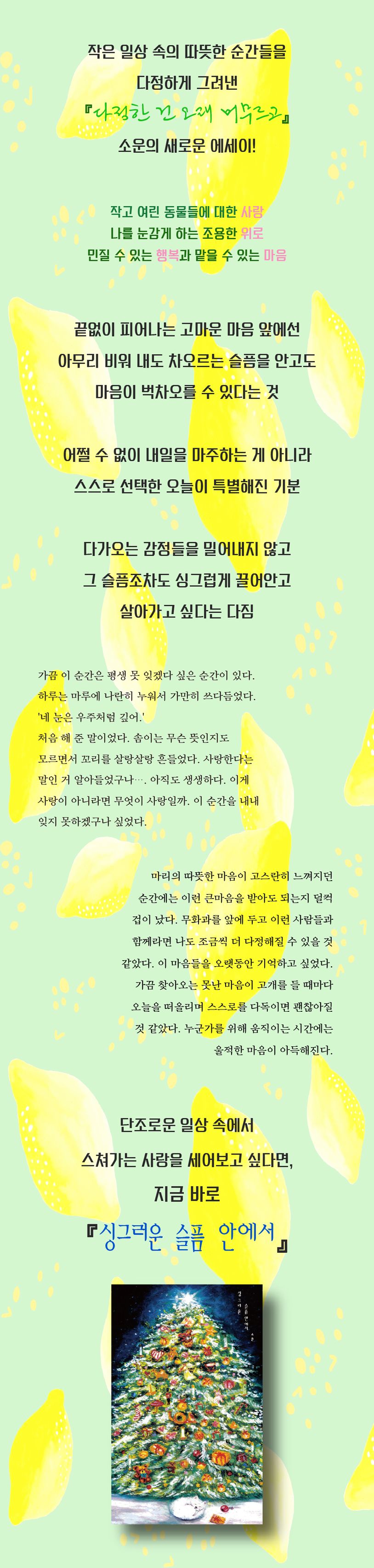 작은 일상 속의 따뜻한 순간들을 다정하게 그려낸 『다정한 건 오래 머무르고』의 소운 작가의 새로운 에세이!