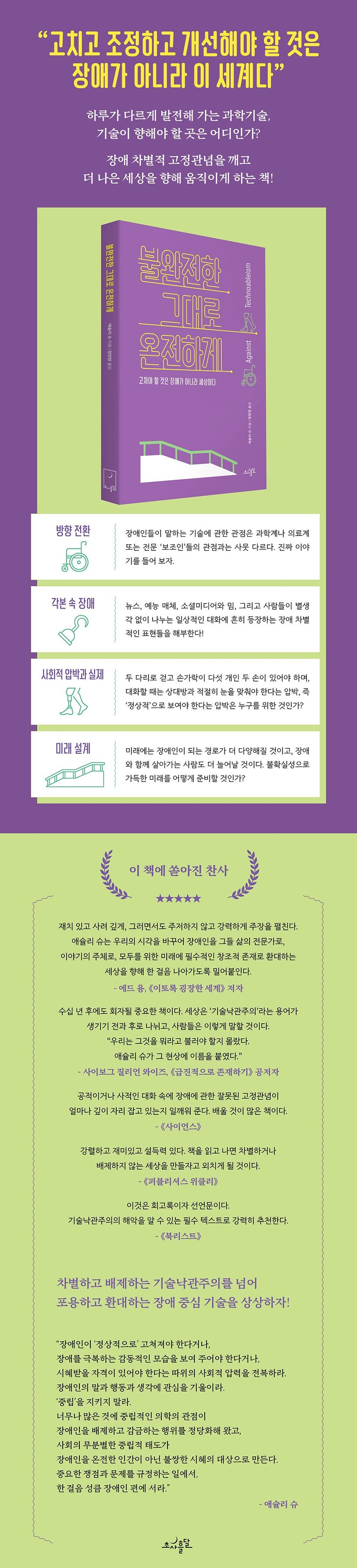 이 책은 애슐리 슈가 기술낙관주의에 관하여 10년 가까이 파고들어 온 생각들을 정리해 담은 것이다. 그녀는 우리 사회에 만연한 장애 차별적 고정관념을 하나하나 짚어 보고, 기술낙관주의가 어떤 식으로 사회에 해를 끼치는지 설명한다. 그리고 장애인과 기술의 관계, 기술의 사회적 책임, 접근성과 포용성에 관한 논의를 펼쳐 보이며, 기술이 발전해 가야 할 방향을 다시 생각해 보자고 권한다. 기술낙관주의에 기댄 기술 발전 방향과 마케팅은 장애가 나쁜 것이므로 제거해야 한다고 느끼게 만든다. 하지만 기술은 능사가 아니다. 애슐리 슈의 이야기를 듣고 나면 고치고 조정하고 개선해야 할 것은 장애가 아니라 이 세상임을 알게 된다.