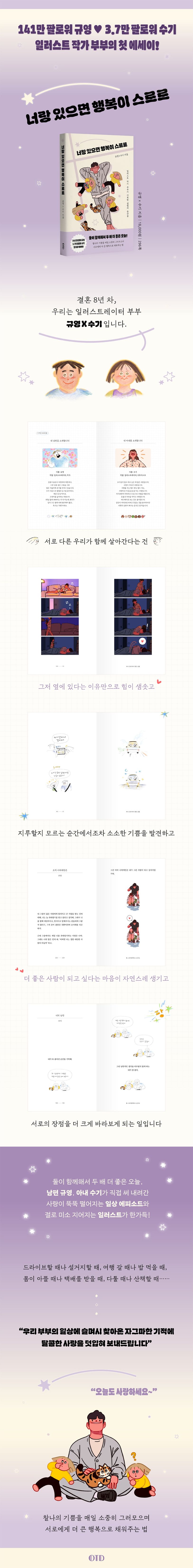 141만 팔로워가 열렬히 ‘좋아요’를 누르는 바로 그 게시물 두 주인공의 등장이라니, 출간 소식이 알려지자마자 뜨거운 기대 속에 응원의 댓글이 쏟아진 가운데 마침내 그들의 이야기가 세상에 공개되었다. 이 책은 결혼 8년 차에도 여전히 서로에게 설레고, 날마다 새롭게 사랑을 발견하는 규영, 수기 부부의 소소하지만 특별한 하루하루를 담고 있다. 매일 네잎클로버 같은 행운이 찾아오지는 않지만, 사랑하는 사람과 함께한다는 것만으로 오늘 하루가 얼마나 소중한지, 찰나의 기쁨을 함께 나눌 수 있다는 것이 얼마나 큰 행복인지, 두 사람은 그 속삭임을 잔잔하고 다정하게 전한다. 둘이 함께 있으면 어느새 행복이 스르르 찾아오는 그 순간 말이다. 우리도 모르게 일상에서 흘려버린 그 반짝이는 순간들을 하나하나 그러모은 규영, 수기 부부. 그들의 글과 그림을 따라가다 보면, 자연스레 우리 마음에도 사랑하고 싶은 마음이 슬며시 녹아들면서 만면에 미소가 가득해질 것이다.