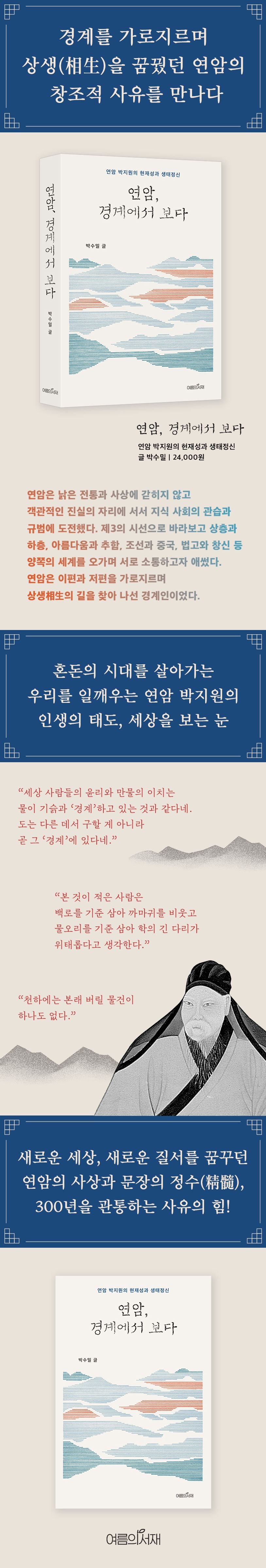 이 책은 닫힌 세상을 온몸으로 통과한 연암 박지원의 창조적 사유가 담긴 철학서이기도 하다. 혼돈의 시대, 파벌과 편견으로 가득한 세상에서 이탈해 새로운 세계를 찾아 나선 경계인 연암의 개혁자이자 사상가로서의 여정을 따라가 보자.