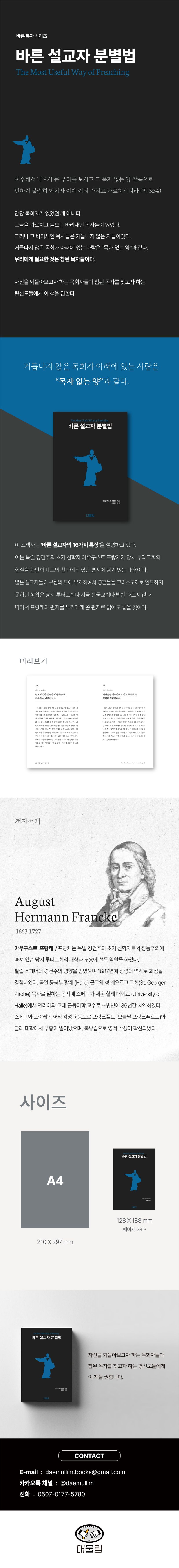 이 소책자는 ‘바른 설교자의 16가지 특징’을 설명하고 있다. 이는 독일 경건주의 초기 신학자 아우구스트 프랑케가 당시 루터교회의 현실을 한탄하며 그의 친구에게썼던 편지에 담겨 있는 내용이다. 많은 설교자들이 구원의 도에 무지하여서 영혼들을 그리스도께로 인도하지 못하던 상황은 당시 루터교회나 지금 한국교회나 별반다르지 않다. 따라서 프랑케의 편지를 우리에게 쓴 편지로 읽어도 좋을 것이다.