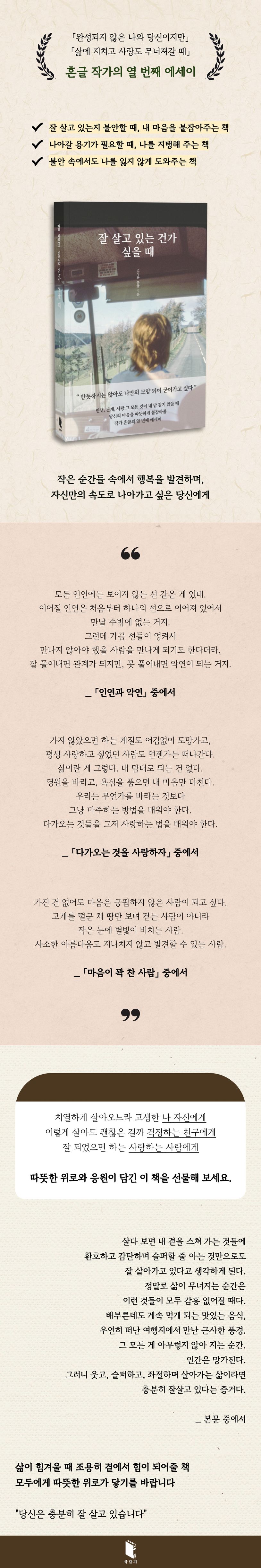 오늘의 너에게」, 「내가 소홀했던 것들」등으로 수많은 독자의 마음을 어루만져온 흔글의 신간 《잘 살고 있는 건가 싶을 때》는