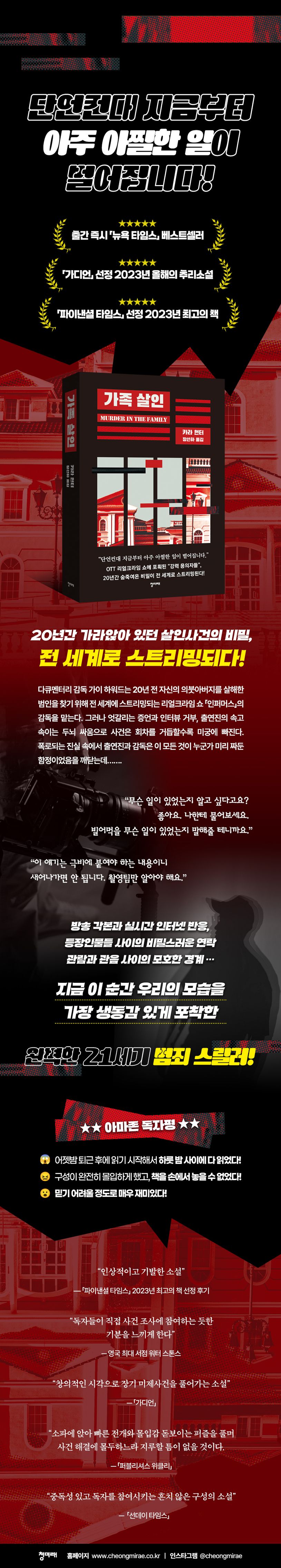 전 세계 27개 언어로 번역되며 추리소설의 “신기원”이라는 극찬을 받은 베스트셀러 작가 카라 헌터의 추리소설이 마침내 한국에 출간되었다. “완벽하게 21세기적인 범죄 스릴러”라는 찬사를 받은 『가족 살인』은 방송 각본, 미디어 리뷰 기사, 인터넷 게시판 등 오늘날 독자들에게 가장 친숙한 미디어 요소들을 적극적으로 차용한 소설로, 전통적인 소설이라면 당연히 등장할 “서술자”의 시선을 철저히 배제함으로써 실제 리얼크라임 쇼를 보며 추리에 참여하는 듯한 생생함을 선사한다. 독특한 설정으로 주목을 받은 이 소설은 출간 즉시 「뉴욕 타임스」의 베스트셀러로 선정되었고, 「가디언」 선정 올해의 추리소설, 「파이낸셜 타임스」선정 2023년 최고의 책에 꼽히며 많은 사랑을 받았다. 독자들은 각각의 자료들이 직조하는 사건의 진상을 추리하며 때로는 소설 바깥의 독자로서, 때로는 소설 속 리얼크라임 쇼의 시청자로서 새로운 재미를 느낄 수 있을 것이다.