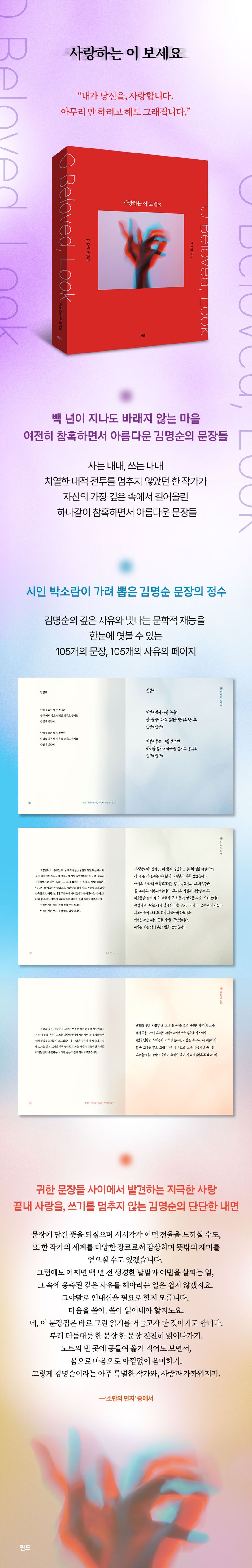 100년 전 활동했던 선구적인 예술가 김명순의 작품을 현대어로 옮기며 한국문학의 계보를 다시금 되짚어준 시인 박소란이 그간 진행해온 편역 작업을 바탕으로 김명순 문장의 정수를 가려 뽑아 문장집 『사랑하는 이 보세요』를 묶었다. 시, 소설, 희곡, 에세이 등 다양한 장르의 글을 썼던 김명순의 작품을 에세이집 『사랑은 무한대이외다』(2023, 핀드), 소설집 『내 마음을 쏟지요 쏟지요』(2025, 핀드)를 통해 장르를 나누어 살필 기회를 주었던 박소란 시인이 이번에는 김명순의 시 20편, 소설 14편, 희곡 1편, 에세이 15편에서 그의 깊은 사유와 빛나는 문학적 재능을 한눈에 엿볼 수 있는 문장을 찾아 총 105개의 대목, 105개의 사유의 페이지를 펼쳐놓는다. 문장집 『사랑하는 이 보세요』는 김명순이라는 이름을 처음 접하는 독자들에게는 그의 매력을 확인할 수 있는 마중물이 되고, 김명순의 문장을 이미 아끼는 독자들에게는 그의 글을 더 깊이 되새기며 자기만의 글쓰기로 확장할 수 있는 기회를 제공할 것이다.
