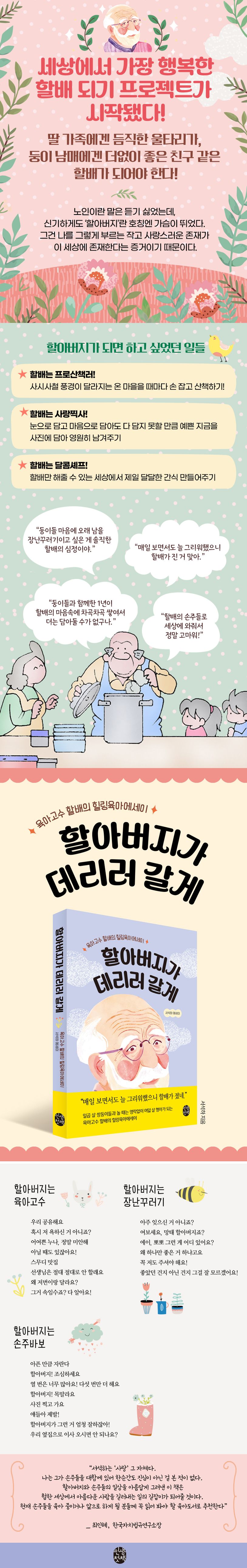 노인이 된다는 건 세상의 중심에서 조금은 밀려나는 일인 것만 같다. 여전히 활력이 넘치고 열정이 샘솟는데 ‘늙은 사람’이라는 뜻의 ‘노인’으로 불리는 건 절대 유쾌한 일은 아니다. 그런데 신기하게도 ‘할아버지’란 호칭엔 가슴이 뛰었다고 작가는 말한다. 그건 나를 그렇게 부르는 사랑스러운 존재가 이 세상에 존재한다는 증거이기 때문이다.