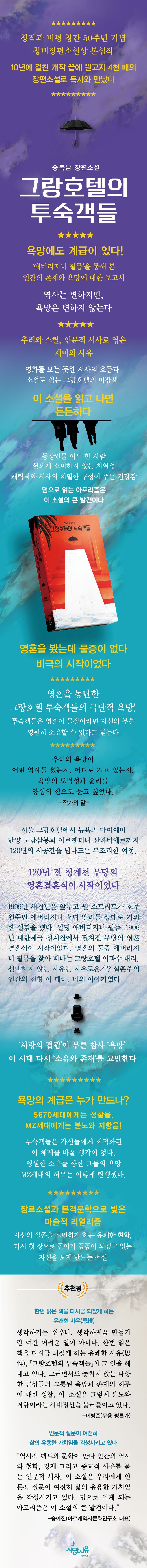 세상의 모든 불안과 욕망은 사랑의 결핍에서 온다. 사랑의 결핍이 부른 참사 ‘욕망’, 이 물질 만능주의의 대안으로 소설은 영혼 대신 사랑을 꼽는다. 사랑은 오랜 인류의 결핍이자 소망이다. 그 결핍이 인간에게 불안과 극단적 욕망을 부추긴다. 『그랑호텔의 투숙객들』은 인간의 욕망과 존재의 이중성 그리고 이 둘 사이의 부조리를 인물의 성격과 퍼즐처럼 촘촘한 서사 그리고 철학적이고 종교적 사유를 통해 천착하고 있다.
