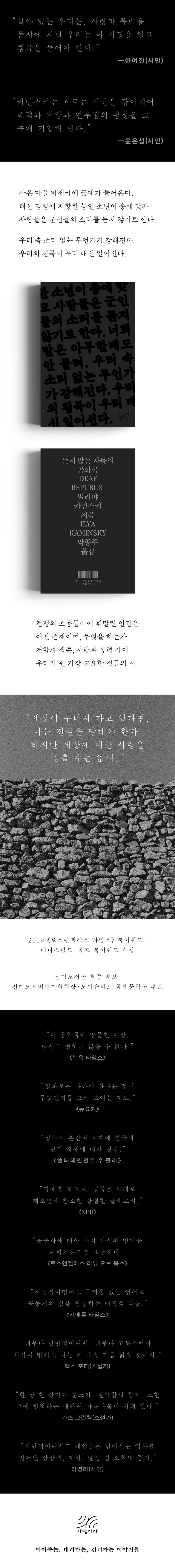 일리야 카민스키의 서사시 《듣지 않는 자들의 공화국》은 전쟁에 처한 인간을 세밀하게 들여다본다. 소년의 죽음은 마을이 뭉쳐 일어서는 계기가 되지만 공포와 혼란이 계속되면서 사람들에게는 자신의 생존을 위해 결정해야 하는 순간이 온다. 그러나, 그 다양한 경로들 사이에서 인간이 가장 나중까지 지닌 것은 무엇일까. 실존적 질문을 던지며 삶은 이어진다.