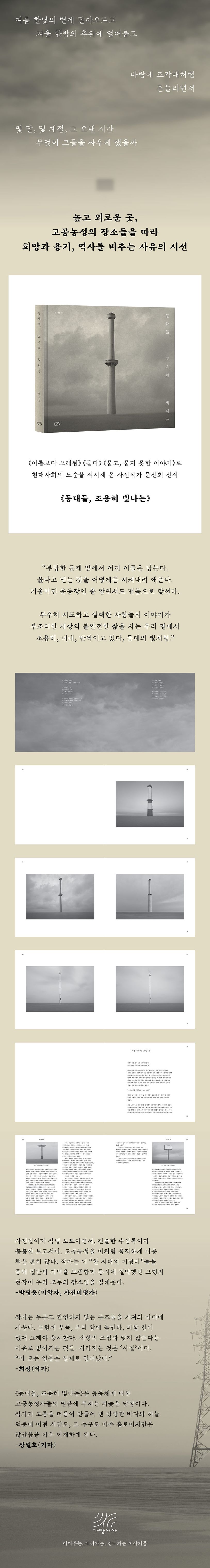《등대들, 조용히 빛나는》는 2005~2019년 사이 고공농성 장소 서른세 곳의 사진과 그 사연을 담은 책이다. 문선희 사진작가는 2015년 당시 세계 최장기였던 스타케미칼 해고 노동자 차광호 씨의 고공농성을 계기로 과거 농성이 있었던 전국의 굴뚝과 송전탑, CCTV 탑, 전광판을 찾아 찍었다. 그리고 각각의 농성 전후 이야기를 갈무리해 함께 실었다. 노동환경이 급격히 변화한 시대·사회적 맥락 속에서 고공농성자들이 겪은 일과 해낸 일을 정확히 목격하고 기억하려는 취지였다.