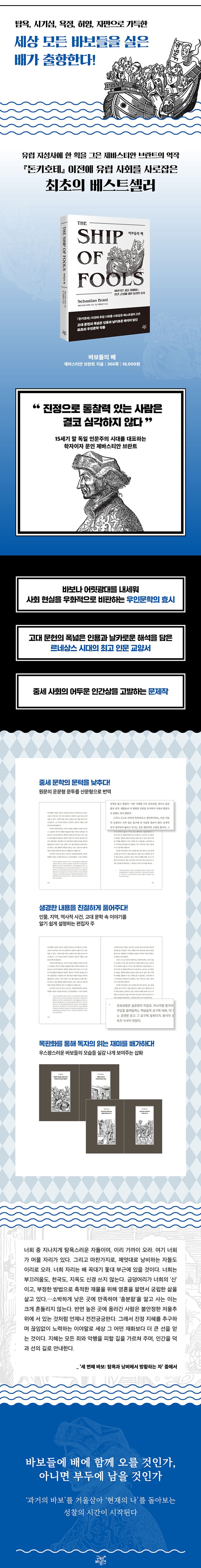 유럽 지성사에 한 획을 그은 제바스티안 브란트의 『바보들의 배』는 우리에게 다음과 같은 근원적인 질문을 던질 것이다. 바보들의 배에 함께 오를 것인가, 아니면 부두에 남을 것인가. 인간 군상의 온갖 어리석음을 유쾌하면서도 냉소적으로 그린 브란트의 시선을 통해 현재 나의 모습과 참된 삶을 살기 위해 필요한 덕목을 돌아보는 시간을 가질 수 있을 것이다.