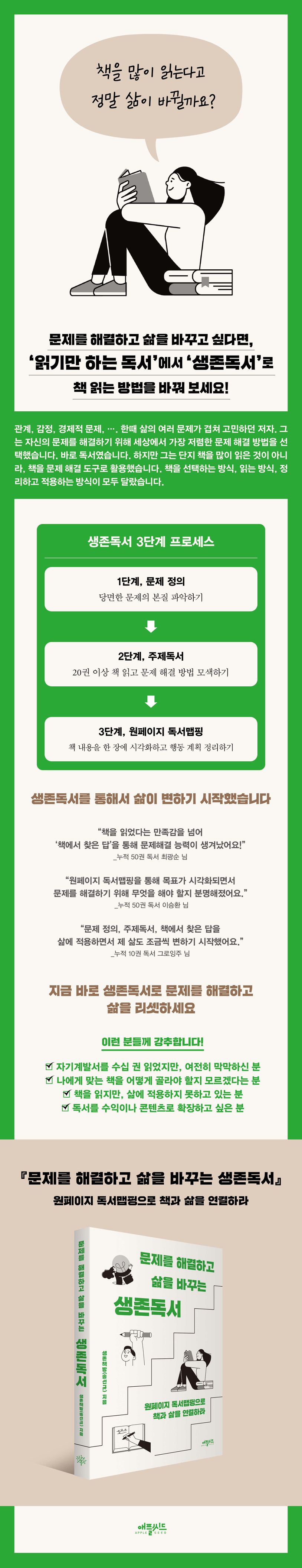 단순히 책을 많이 읽는다고 삶이 달라지진 않습니다. 하지만 이 책에 들어 있는 ‘생존독서’ 전략을 적용해서 책을 읽는다면, 상황이 달라질 수 있습니다. 경제적 문제, 인간관계 갈등, 자신감 저하 …. . 이 책에는 누구나 겪는 삶의 문제를 독서로 돌파해 낸 실제 경험과 함께, 누구나 따라 할 수 있는 3단계 생존독서 프로세스가 들어 있기 때문입니다.