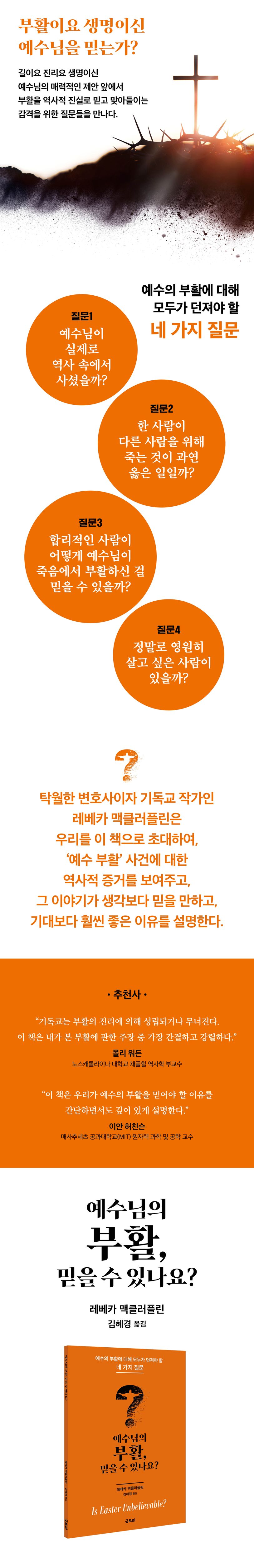 얇은 이 책에서 저자는 예수님의 부활이 역사적 진실임을 짧으면서도 강렬하게, 그리고 명확하게 증언한다. 먼저 초현실적인 이야기에 반신반의하는 이들을 향해 그분의 부활과 관련된 네 가지의 근본적인 질문을 던진다. 그리고는 복음서를 통해 예수님의 존재와 삶이 역사적 진실임을 설명하고, 그분의 죽음이 정의로운 이유를 사랑과 섬김에 근거하여 밝힌다. 여기서 더 나아가, 네 가지의 역사적 증거를 통해 부활의 신뢰성을 밝히고, ‘예수 부활’에 담긴 그분의 매력적인 제안이 갖는 의미를 다시금 새기게 안내한다.