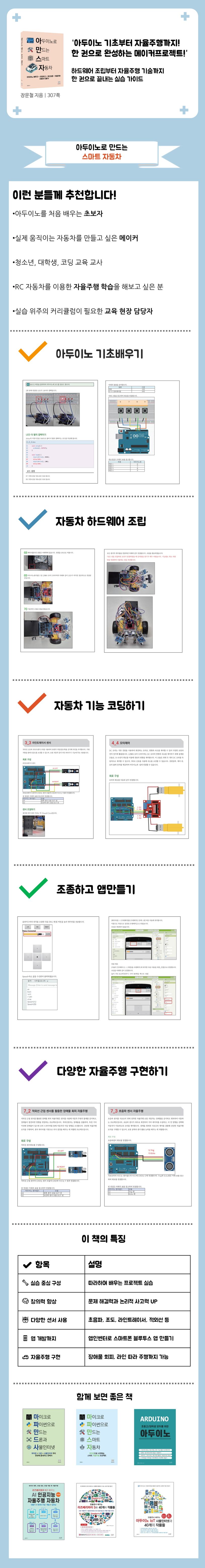 이 책은 아두이노를 처음 접하는 입문자부터 실제 작동하는 자율주행 RC 자동차를 만들고자 하는 메이커까지를 위한 실습 중심의 안내서입니다. 아두이노의 기본 문법부터 시작해 다양한 센서와 모터, 블루투스 통신, 스마트폰 앱 제어, 자율주행 구현까지 단계적으로 배울 수 있습니다.