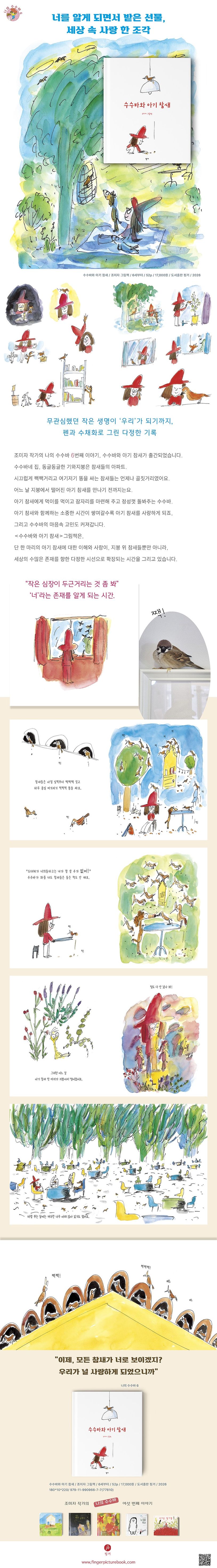 ”도대체가너희들하고는내가잘살수가없어!”짹짹짹!찍찍찍!수수바네기와지붕아래는참새들의북적이는아파트입니다아침마다시끄럽게울어대고,여기저기똥을싸는참새들을수수바는좋아하지않고요.그러던어느날아기참새가지붕에서떨어집니다.아직털도나지않은,작은아기참새를보고깜짝놀란수수바,푸푸,코코는아기참새를정성껏돌보게되죠.그렇게수수바와아이참새와의새로운관계가시작이됩니다.“작은심장이두근거리는것좀봐”‘너’라는존재를알게되는시간.관계의시작이주는선물먹이를먹고,잠이든아기참새를수수바가가만히바라봅니다.힘들게숨을쉬는아기참새의심장이두근거립니다.아기참새를바라보는수수바의심장도함께두근거립니다.아프지말고잘자라건강해져서,짹짹거리며하늘을날아다니는바램을가져봅니다.시끄럽고지저분하다고만생각했던참새가이제수수바에게는더이상싫은존재가아닙니다.애틋하고사랑스러운‘너’가된것이죠.우리는저마다의방식으로삶을살아갑니다.서로의다름은누구에게피해를주기위함이아닌그저각자의생활방식인것이죠.우연히시작된관계는이처럼서로의다름을존중하고,이해하고,끝내사랑하게되는특별한경험을선물합니다.이제,모든참새가너로보이겠지?우리가널사랑하게되었으니까”너의자리를응원하며보내주는다정한안녕아기참새와함께하는소중한시간이흘러갈수록수수바의마음속고민이커져만갑니다.창밖을물끄러미바라보는아기참새의뒷모습이어쩐지쓸쓸해보이고,하늘을자유롭게나는새들을볼때면집안의아기참새가떠올랐기때문입니다.수수바는아기참새와의아름다운추억을마음속에간직하며이별을준비합니다.아기참새가다시하늘로돌아가는날,수수바는슬픔보다큰사랑으로배웅을준비합니다.아기참새가'자기만의자리'에서행복하길바라는마음으로요.누군가를깊이이해하고사랑해본경험은우리를변화시킵니다.이름없는무리중하나였던'참새'가'너'라는구체적인존재로다가오는순간,수수바의세계는확장됩니다."이제모든참새가너로보이겠지?"라는수수바의고백처럼,단한존재와의깊은관계는세상에존재하는수많은생명을향한애정어린시선으로이어집니다.펜과수채화로그려진그림은수수바와아기참새의교감과추억의시간을편안하고따뜻하게담아내고있습니다.*인증유형:공급자적합성확인