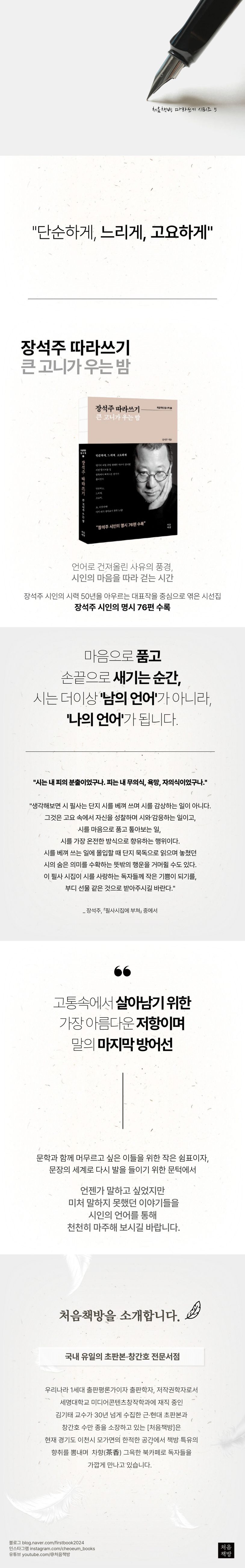 2025년 5월 선보인 『장석주 따라쓰기_큰 고니가 우는 밤』은 초판본 및 창간호 전문서점 겸 출판사 처음책방에서 펴낸 필사책 시리즈의 다섯 번째 편으로, 장석주 시인의 시력 50년을 아우르는 대표작을 중심으로 엮은 시선집을 겸하는 필사책입니다. 단단하면서도 유려한 문장, 깊이 있는 사유, 이미지의 결이 살아 있는 시편들을 따라 읽고, 따라 쓰며, 조용히 자신을 들여다보는 시간이 펼쳐집니다.