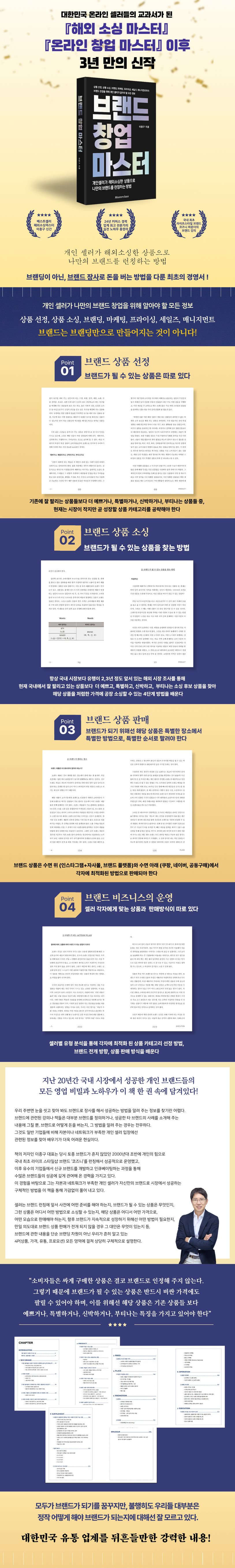 이 책은 성공한 타 브랜딩 사례 소개서가 아닌, 개인 셀러가 온라인 커머스에서 자신만의 브랜드로 성공하기 위해 반드시 알아야 하는 상품 선정 방법, 상품 소싱 노하우, 가격 정책, 마케팅, 브랜딩은 물론, 사전 준비 과정부터 상품 런칭 후 구체적인 액션 플랜에 대한 구체적이고 실질적인 내용을 담고 있다. 이런 이유에서 이 책은 장사를 준비하는 개인 셀러들은 물론, 기존 브랜드를 운영하는 셀러들에게도 근래에 발간된 그 어느 브랜딩, 커머스 관련 서적들보다 더욱 독보적인 가치를 가지고 있다.